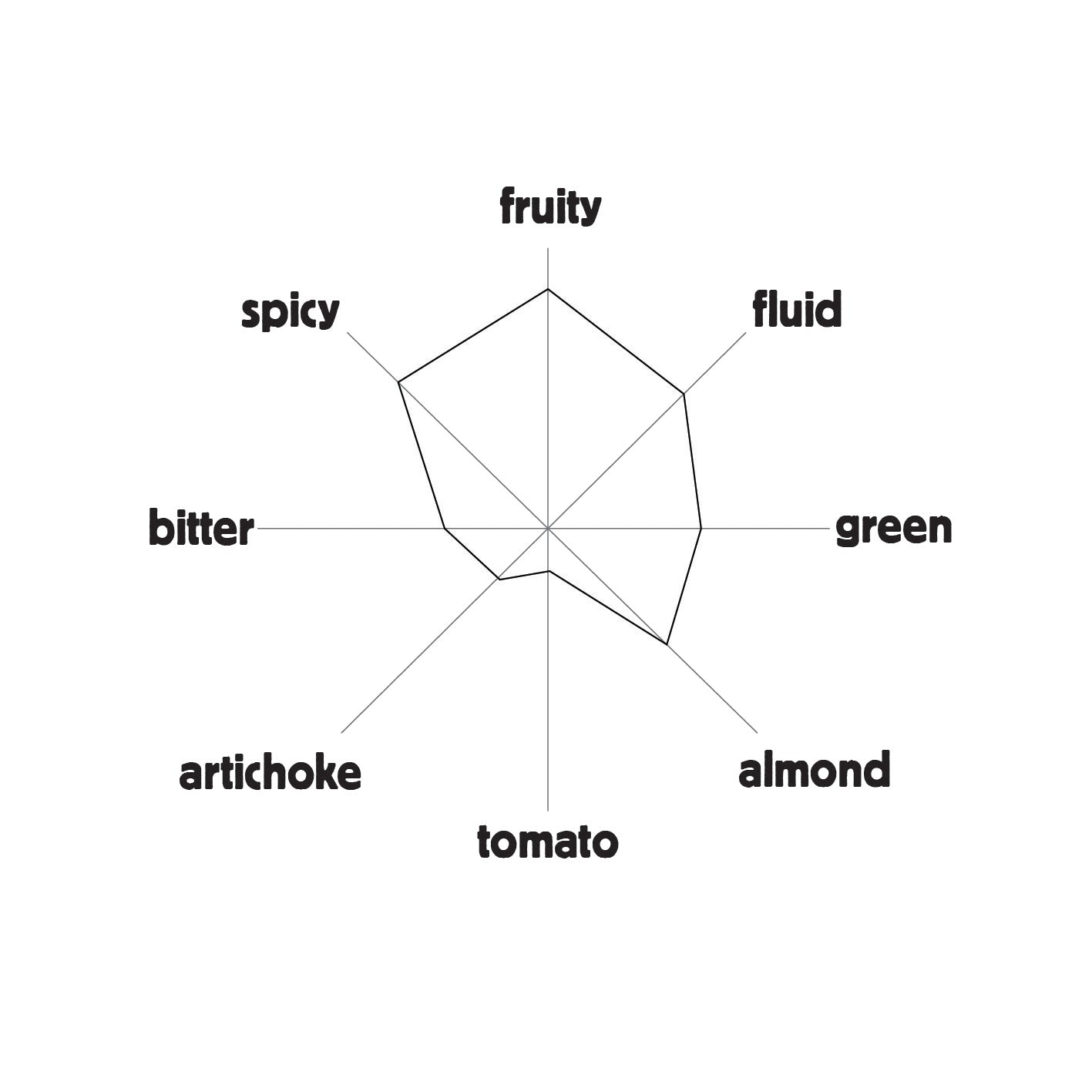 Medium fruitiness and spice. A mellower oil with tasting notes of almond. Best paired with delicate ingredients or drizzled over soups and salads.